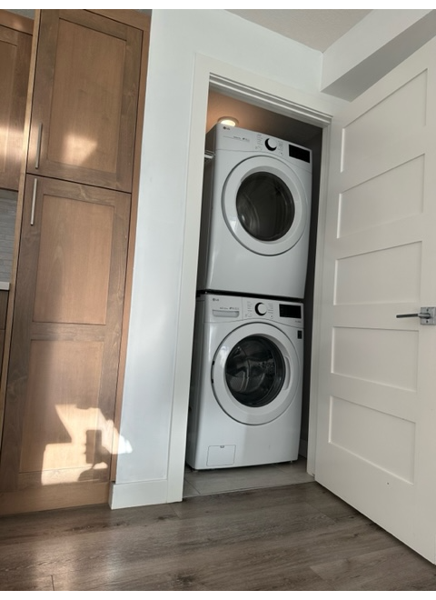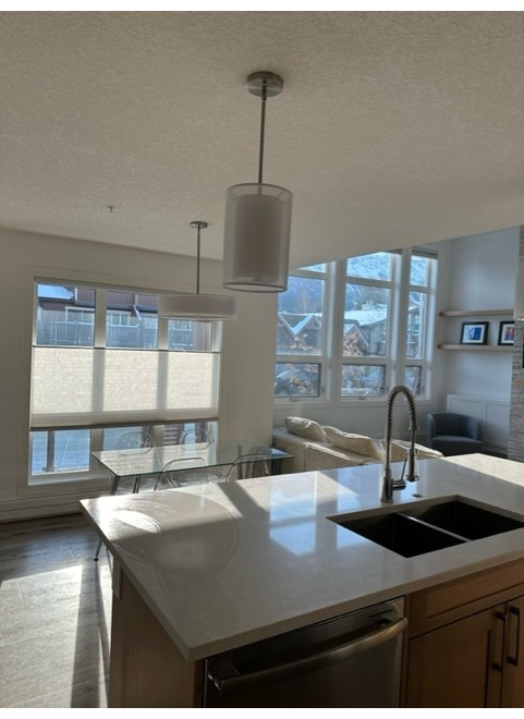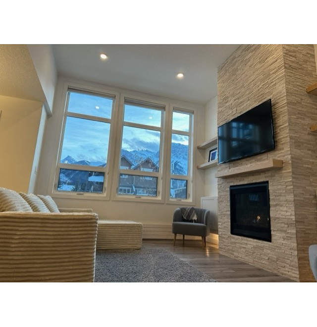 This spacious, fully furnished one-bedroom, one-bathroom condo on 7th St offers comfort, convenience, and iconic mountain views in the heart of Canmore. The suite is well appointed with full-sized appliances, in-suite laundry, large south-facing windows, and 12-foot ceilings in the living area, where the gas fireplace provides warmth and comfort. The bedroom features a king-sized bed and a built-in closet organizer, while the bathroom offers a soothing deep soaker tub. A Murphy bed provides additional sleeping space for guests. The unit also includes a secure underground parking stall and bike storage.