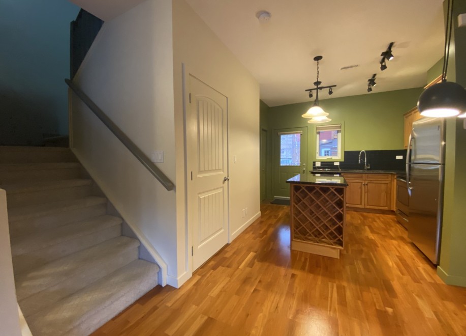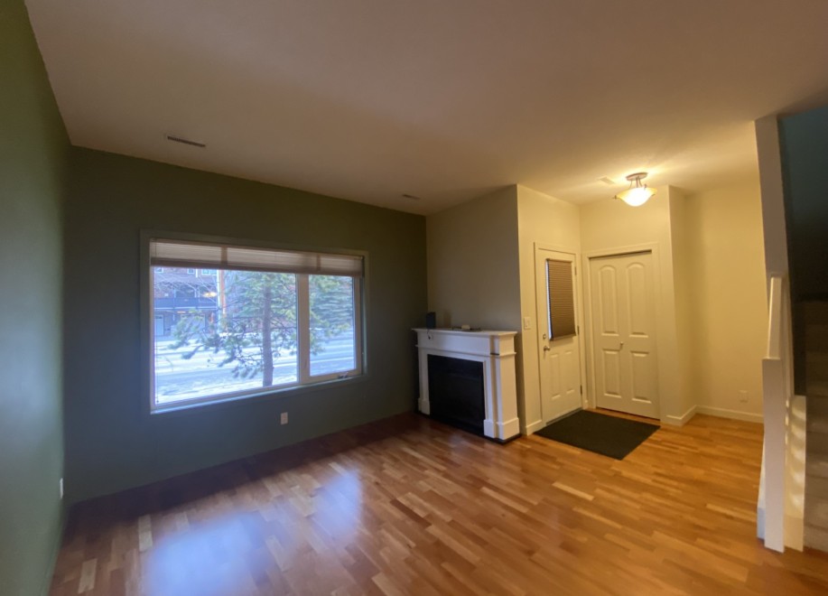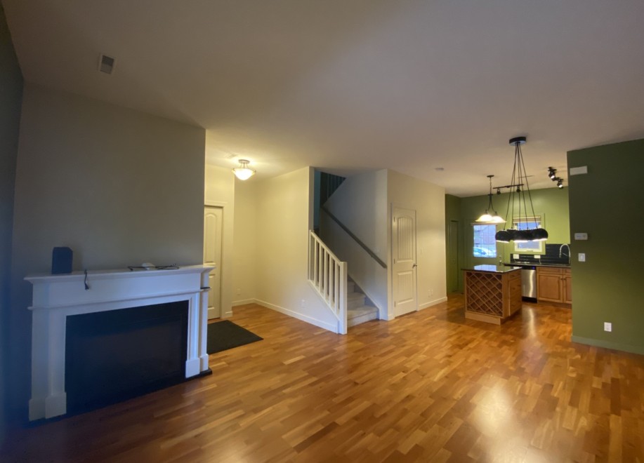 The townhome features a mix of hardwood, carpet, and vinyl flooring throughout. The living area is accented with an electric fireplace. The home includes six appliances in total, including a washer and dryer. A ground-level patio provides private outdoor space directly accessible from the home.